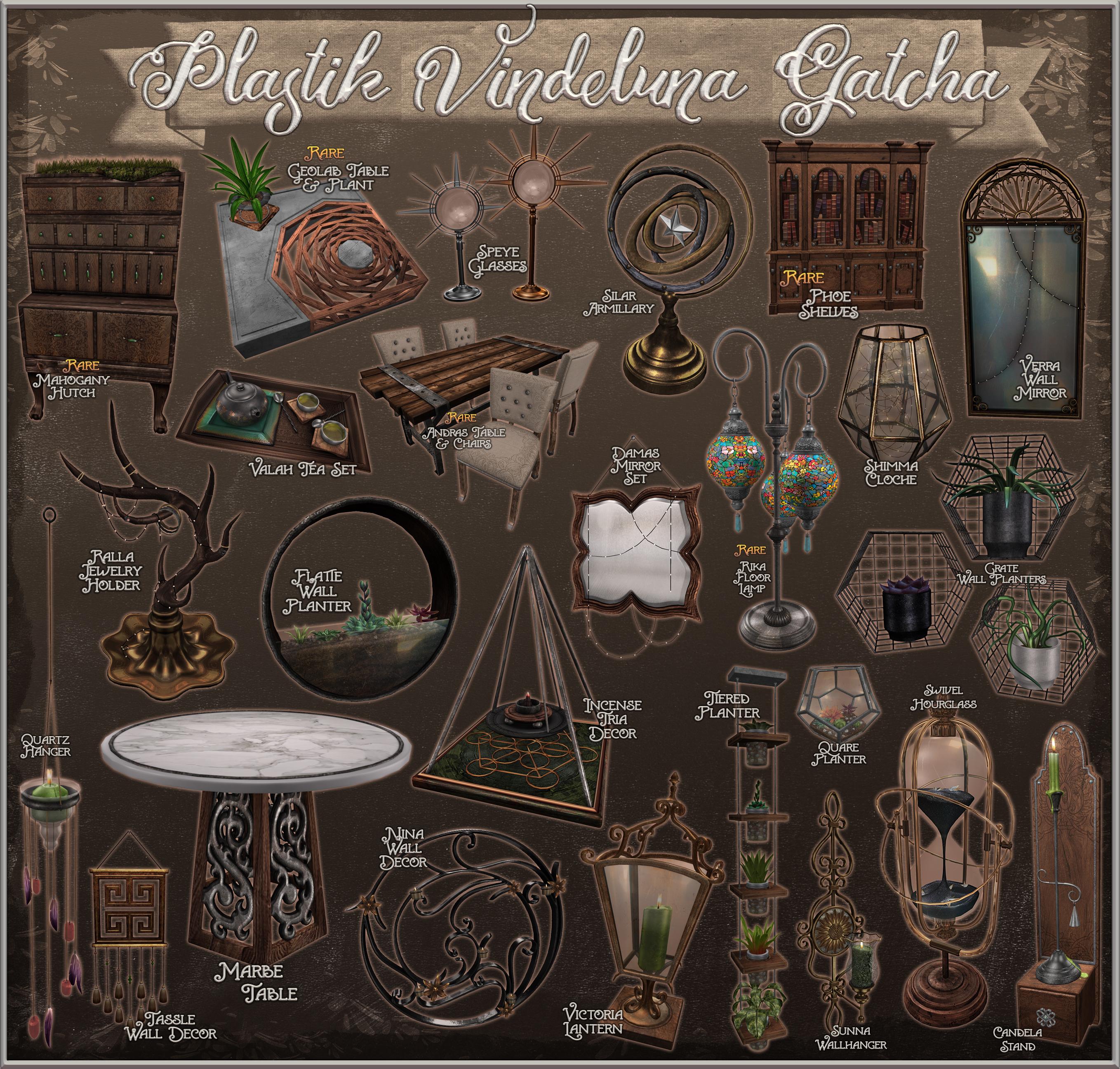 Enter into a world of curious rustic curios and mysterious adornments, items handcrafted from the finest and rarest materials our world has to offer! Decorate your humble abode or sprawling estate with these eccentric and awe-inspiring relics and add a little charm to your home. Illuminate your dwelling with a wide variety of lamps, lanterns and candles. Spruce up the place with a planter or two and take in the exquisite scents they have to offer paired with some incense. Have some tea, tell time or look to the stars and if you’re lucky you might just catch one! A beautiful and wondrous selection awaits you when you play the Vindeluna Gatcha by Plastik!