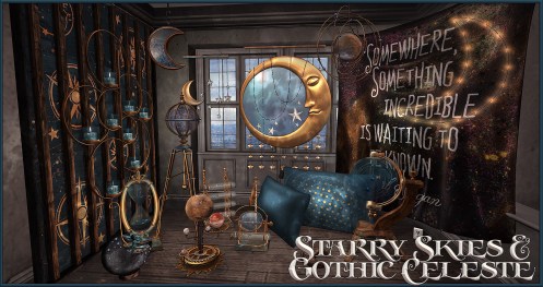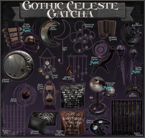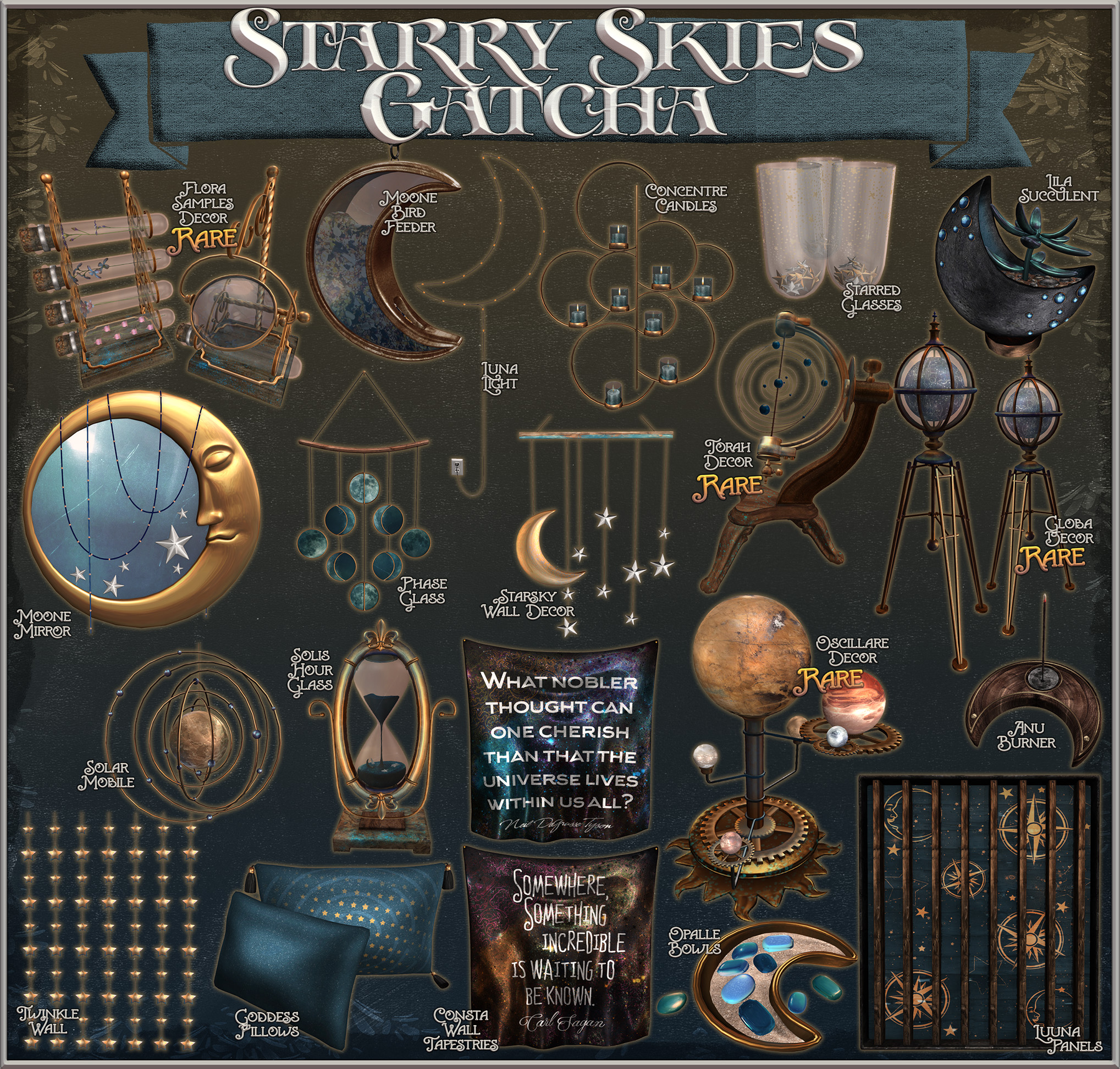 The Starry Skies Gatcha presents an astronomical new collection to tease and tantalize the senses. Never before has there been such a splendid arrangement of decorative trinkets so finely crafted with a love for the stars and the skies and with a deep yearning to simply look upwards. Delight yourself and your guests with the rare and beautiful Flora Samples, Torah, Globa and Oscillare Decor items, each with it’s own unique and special purpose.