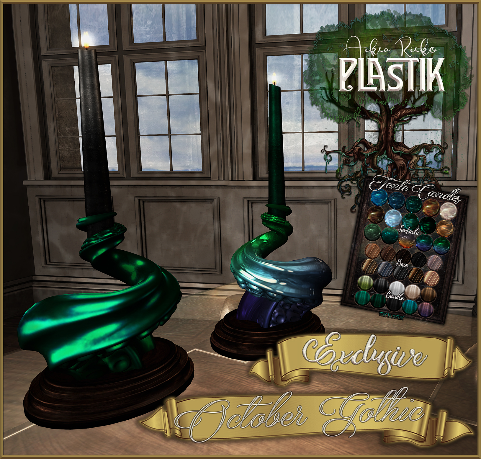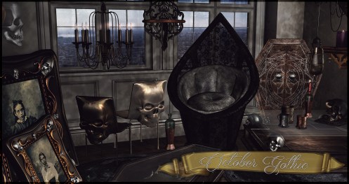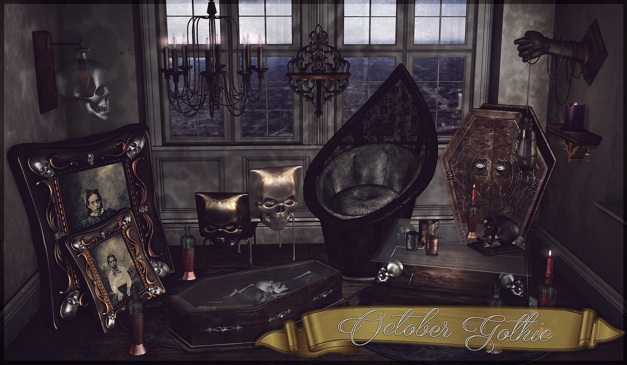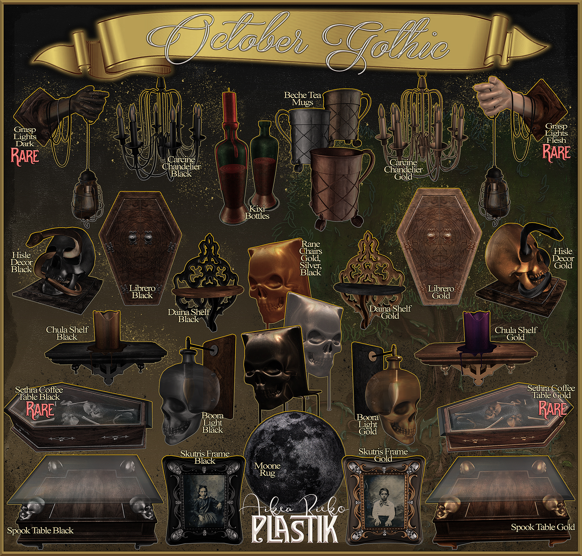 This Gatcha features some gorgeous finds, in BLACK or GOLD. Natural look, or gothic. Rares include coffin table with bone ash and remains, Grasping spooky lamps. and a gorgeous neo-victorian chair with lace wrapped panels and velvet cushions with sit animations.