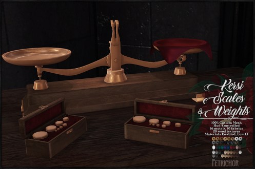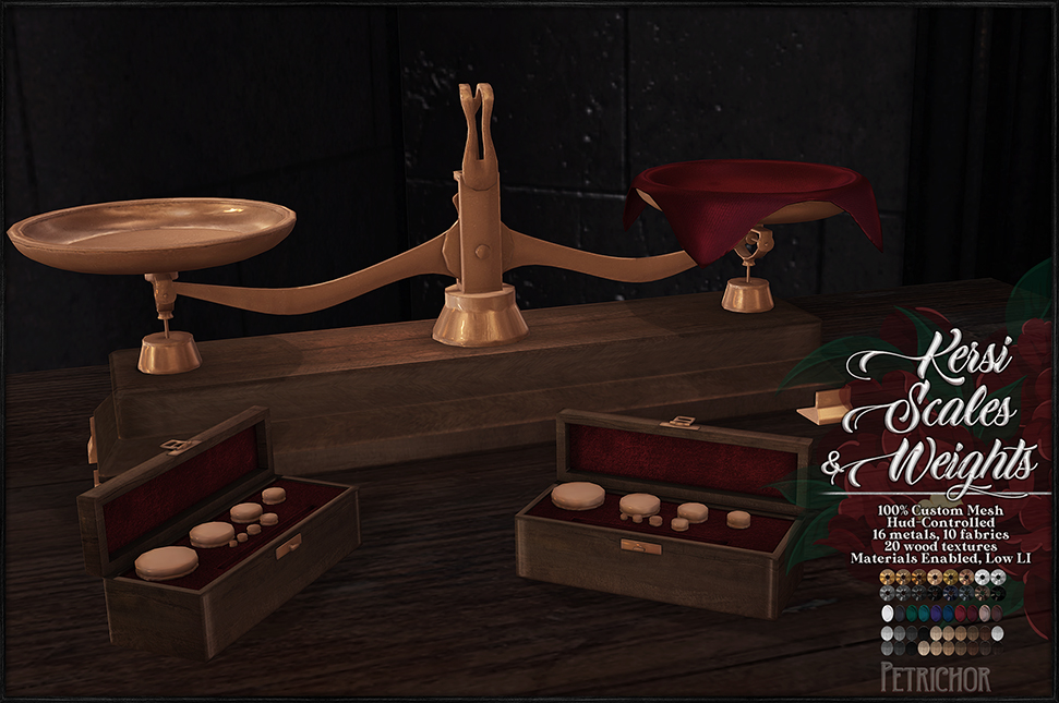 Lush, metal and velvet/silk set for weighing and measuring for any kind of roleplay situation. Comes with a scale & customization HUD, as well as a carved ornate box of weights with a velvet insert & customization HUD.
