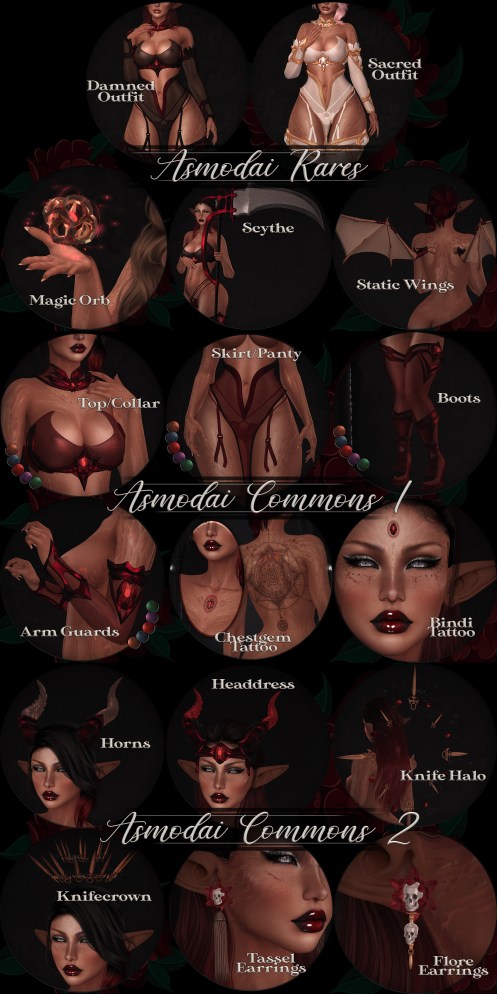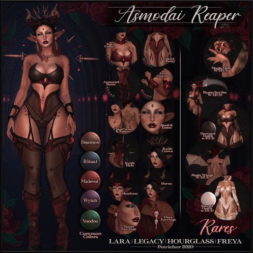 The Asmodai Reaper Gatcha has 33 amazing prizes and is a must have for this halloween season. All the parts are mix and matchable, every piece is hud controlled, and the layering is gorgeous.