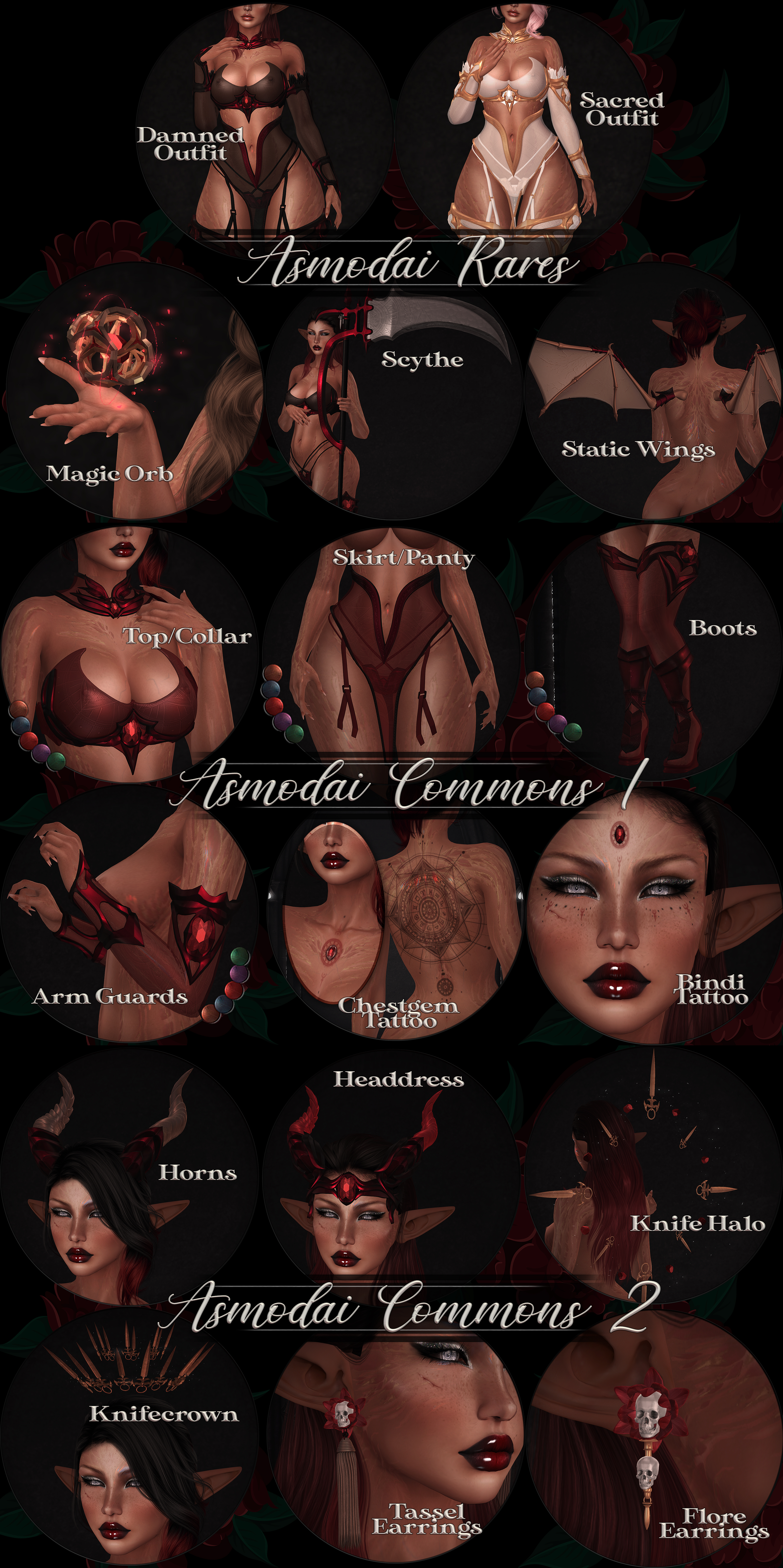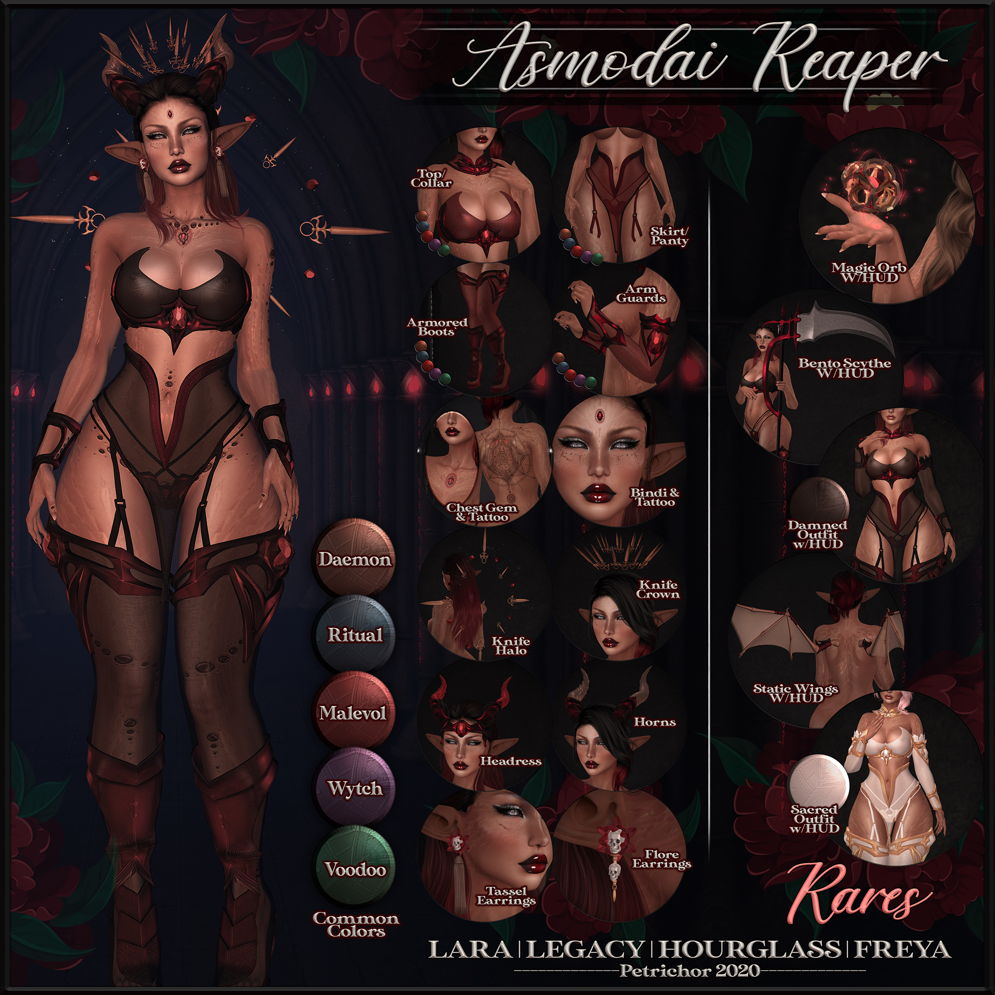 A magic orb and a scythe as weapons with bento hold animations, Static flapping wings, Crowns, tainted halos, BOM tattoos and embedded body gems make this gatcha a truly complete look.