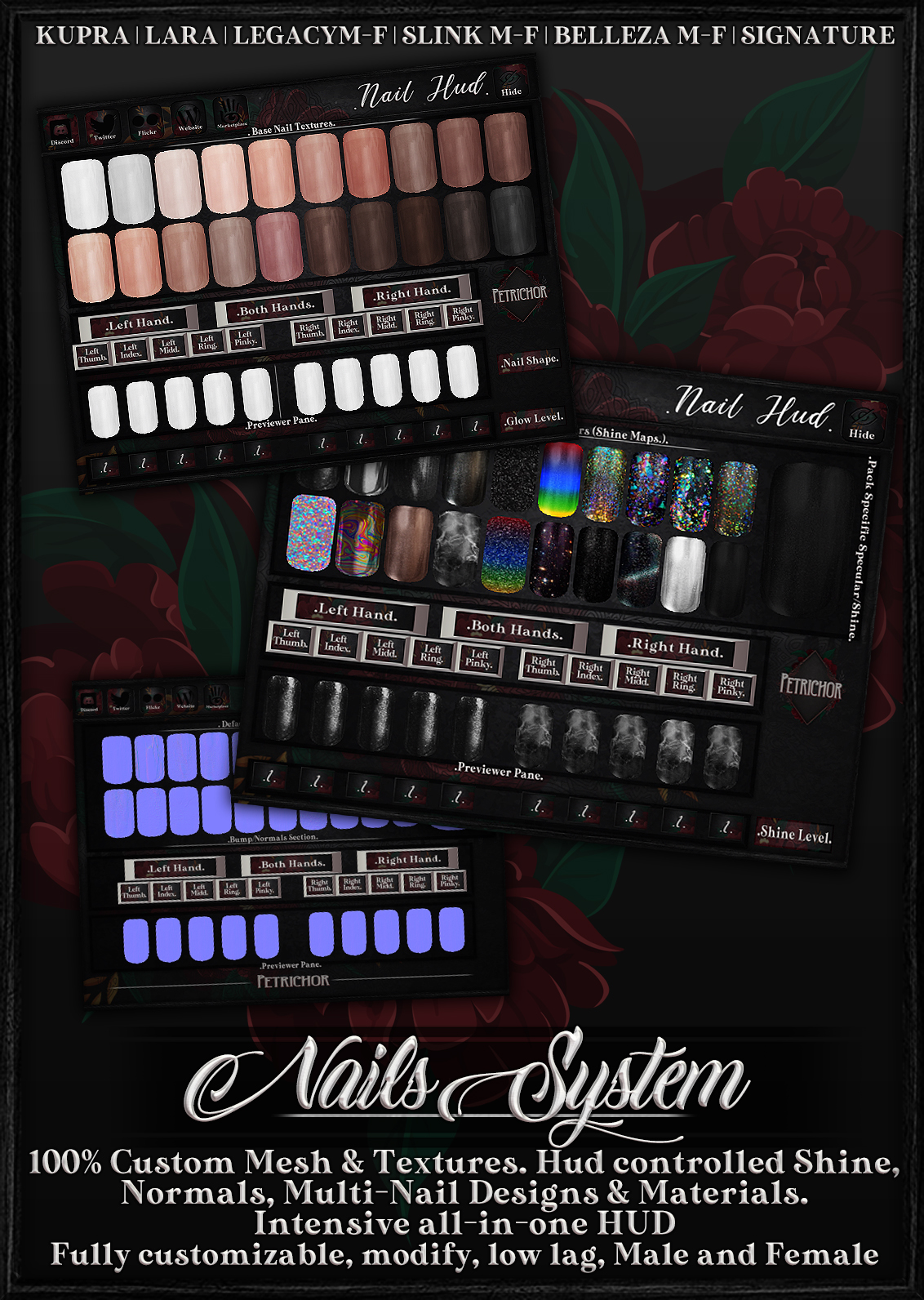 This nail system will work cross-hud, which means you buy the base nails and then there will be fancy packs for pretty nail textures. There is also a DEV KIT for those who want to make their own nail packs. Find it inworld in the Eyes Section or in the Related Items Below.