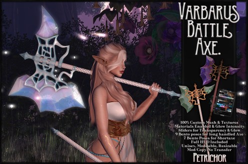 A kickass Battle Axe for your slicey, stabby needs. over 150 textures, glow and transparency sliders, and many, many brand new bento holds for your gorgeous weapon.