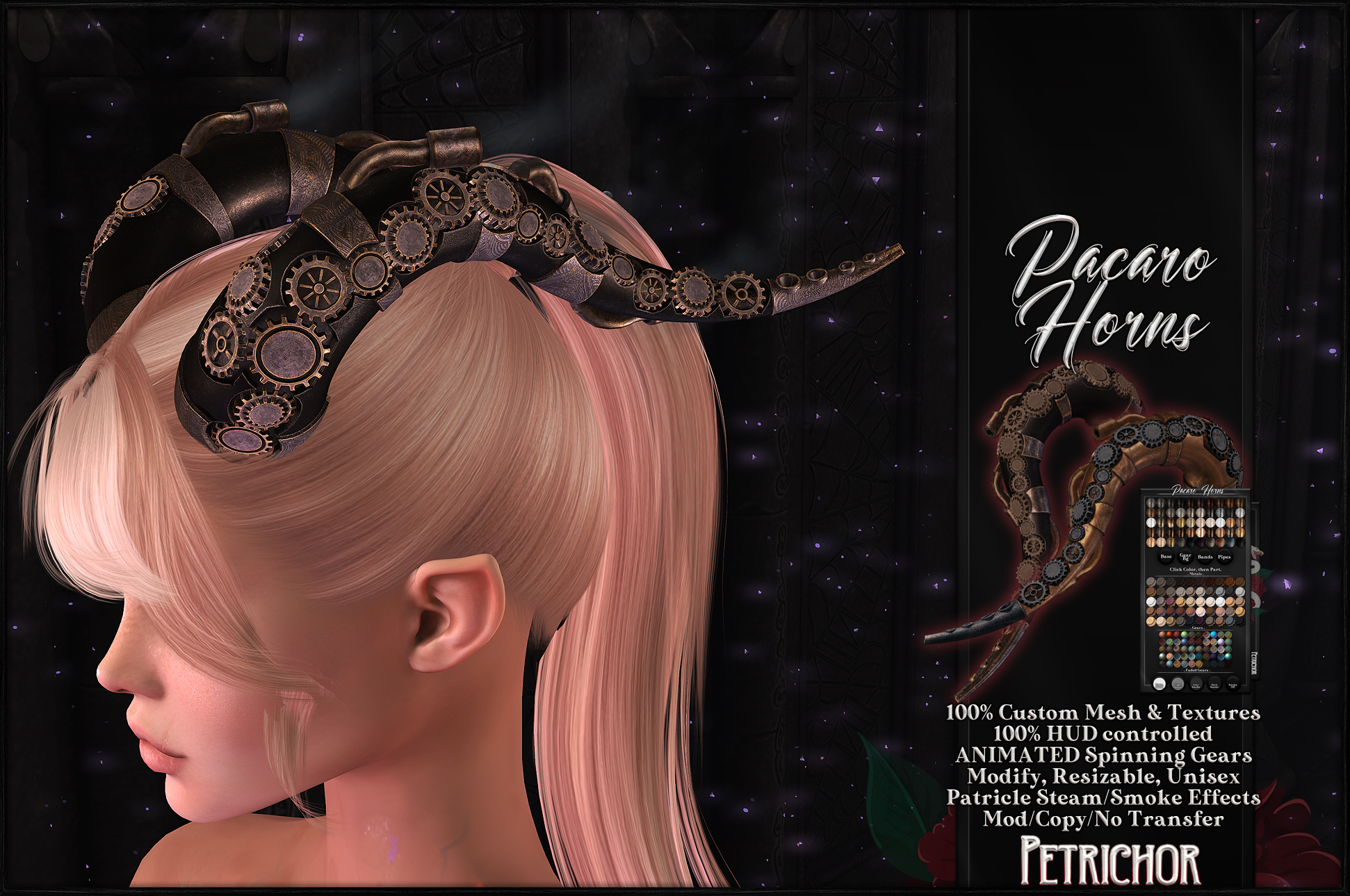 If you’ve ever needed a few more gears and cogs to keep you running then the Pacaro set is for you! The Horns and Cuffs have ANIMATED Gears and everything is all Hud controlled ❤