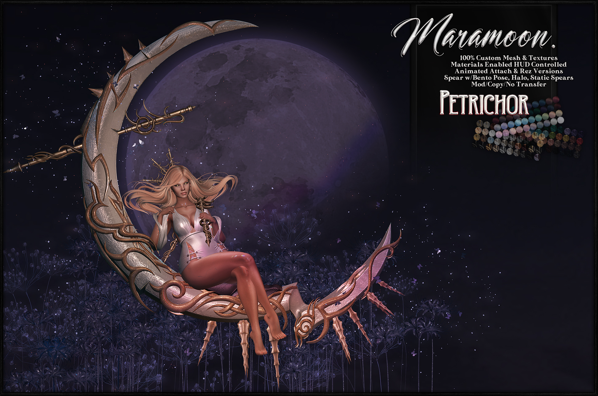 Touch the moon, bind it, and make it yours with this new release! The Maramoon is a beautiful filigree crescent seat that comes as both a rezzable decor version and a wearable! Also included is a matching halo and spears. There’s also three new eyes for the Vaera Eye System and five new polishes for the Vaera Nail System!