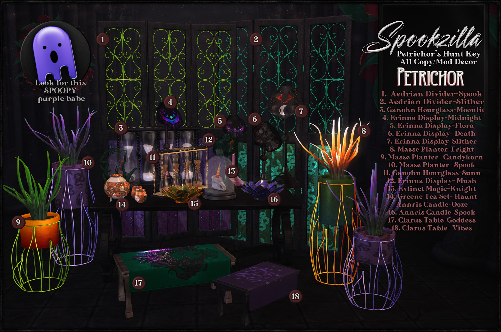 Join us at Spookzilla for a super big spooky time hunt extravaganza! We’ve hidden -eighteen- little purple ghosties around the sim for you to find. Each one contains a piece of creepy seasonal decor!