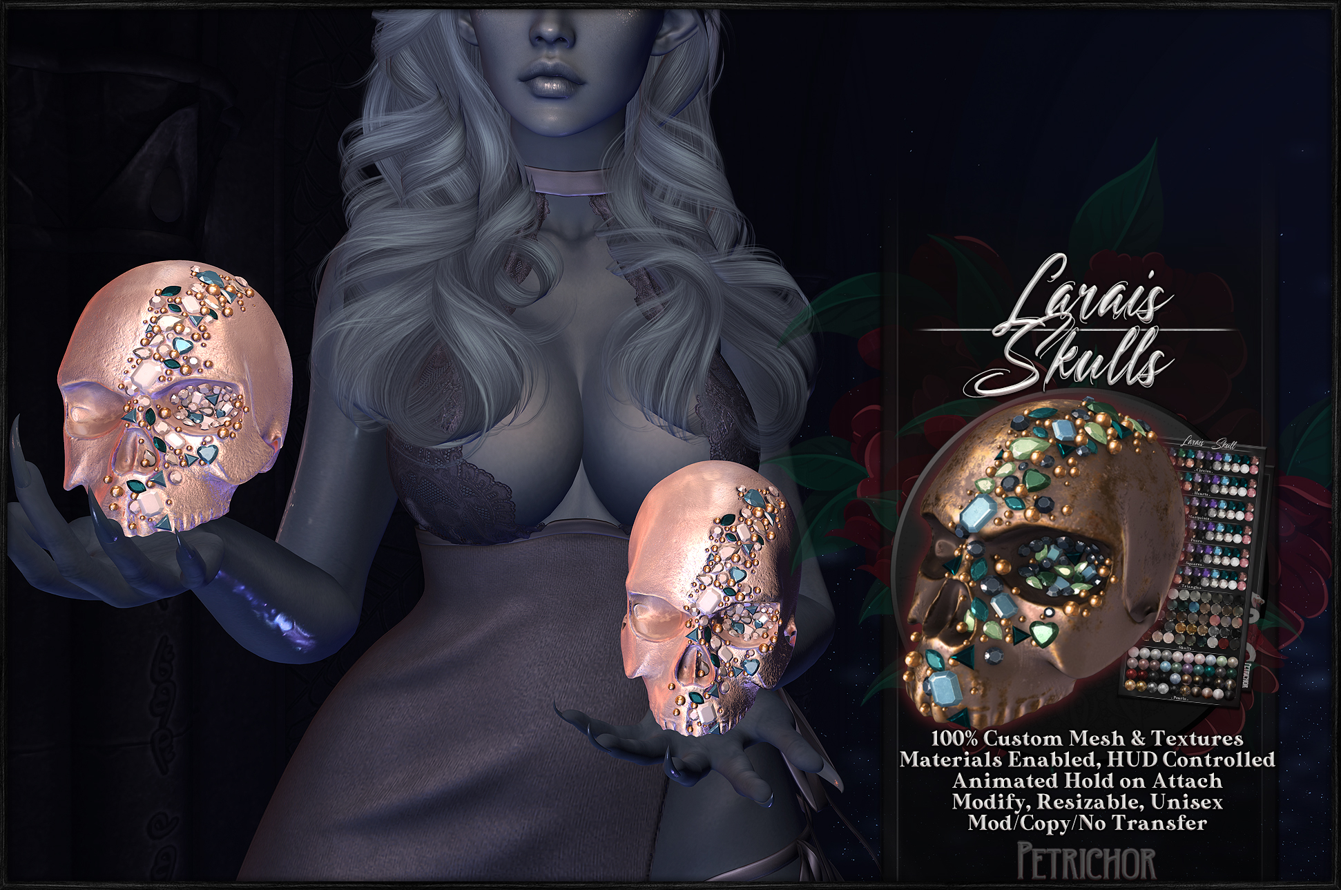 ★ Petrichor was founded in 2006 and we are happy to still be making pretties for your beautiful faces. Gorgeous 100% custom mesh & lush textures, original, handpainted Fantasy skins, items, accessories, decor, and more.
