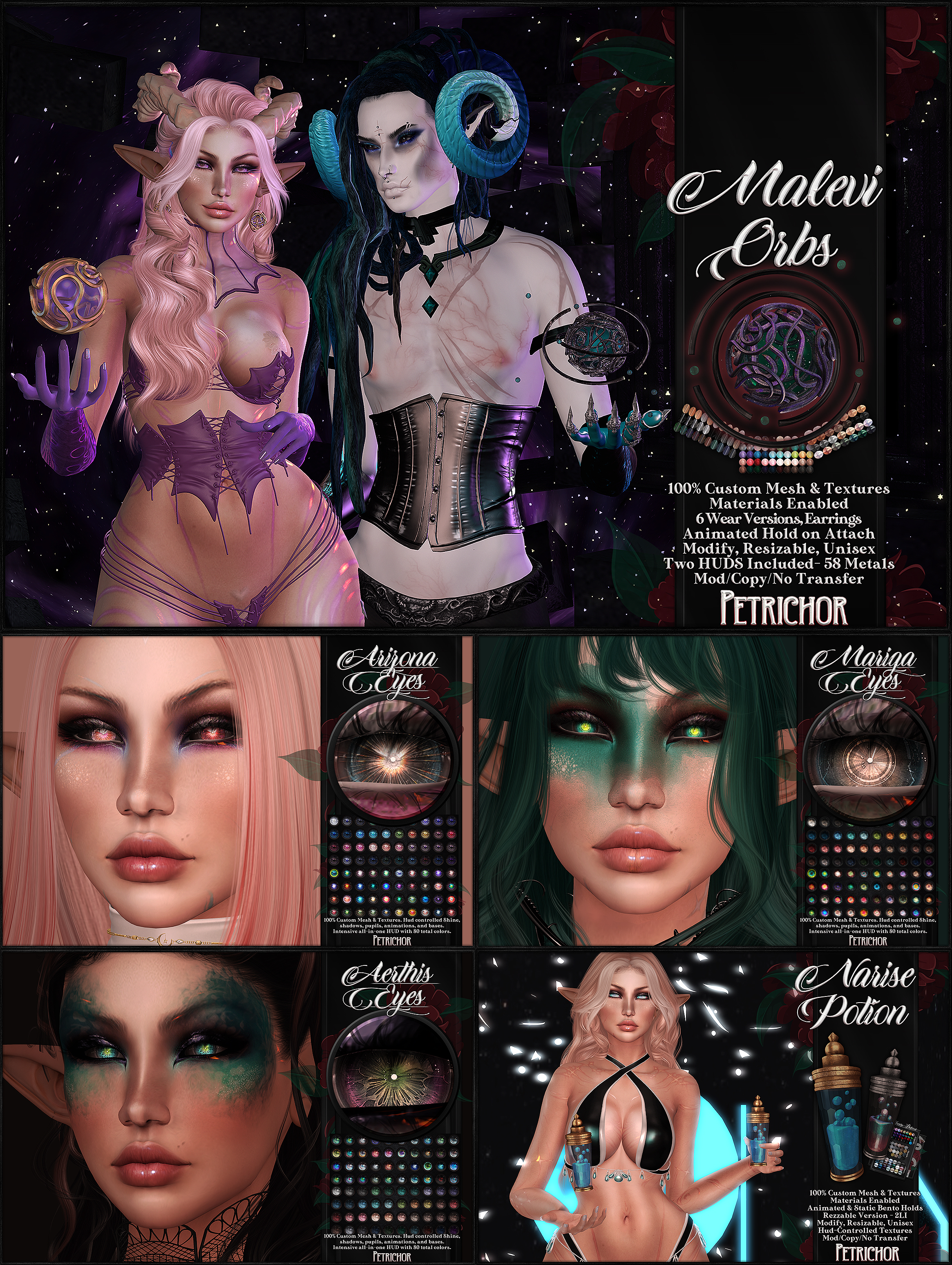 ★ Petrichor was founded in 2006 and we are happy to still be making pretties for your beautiful faces. Gorgeous 100% custom mesh & lush textures, original, handpainted Fantasy skins, items, accessories, decor, and more.